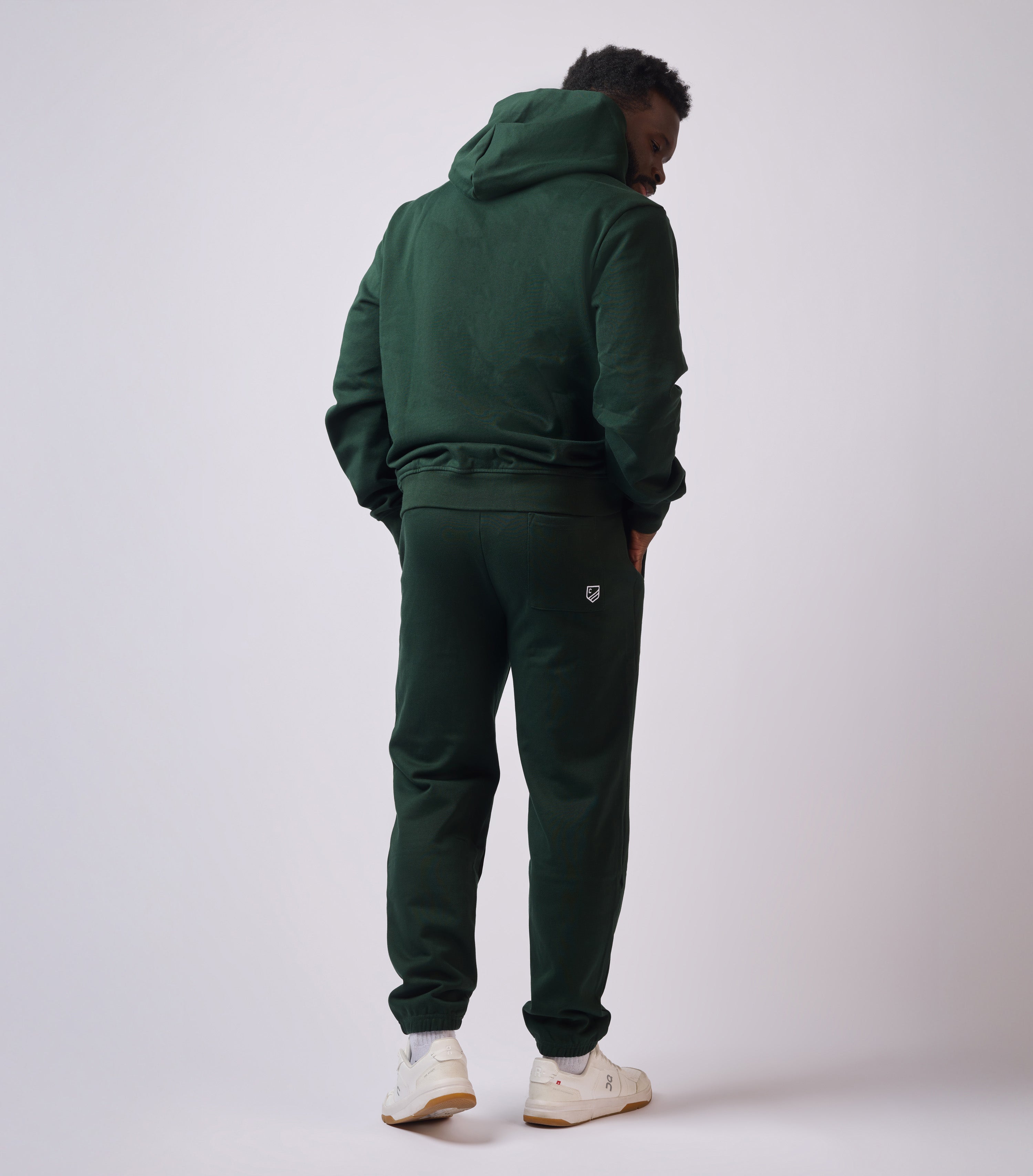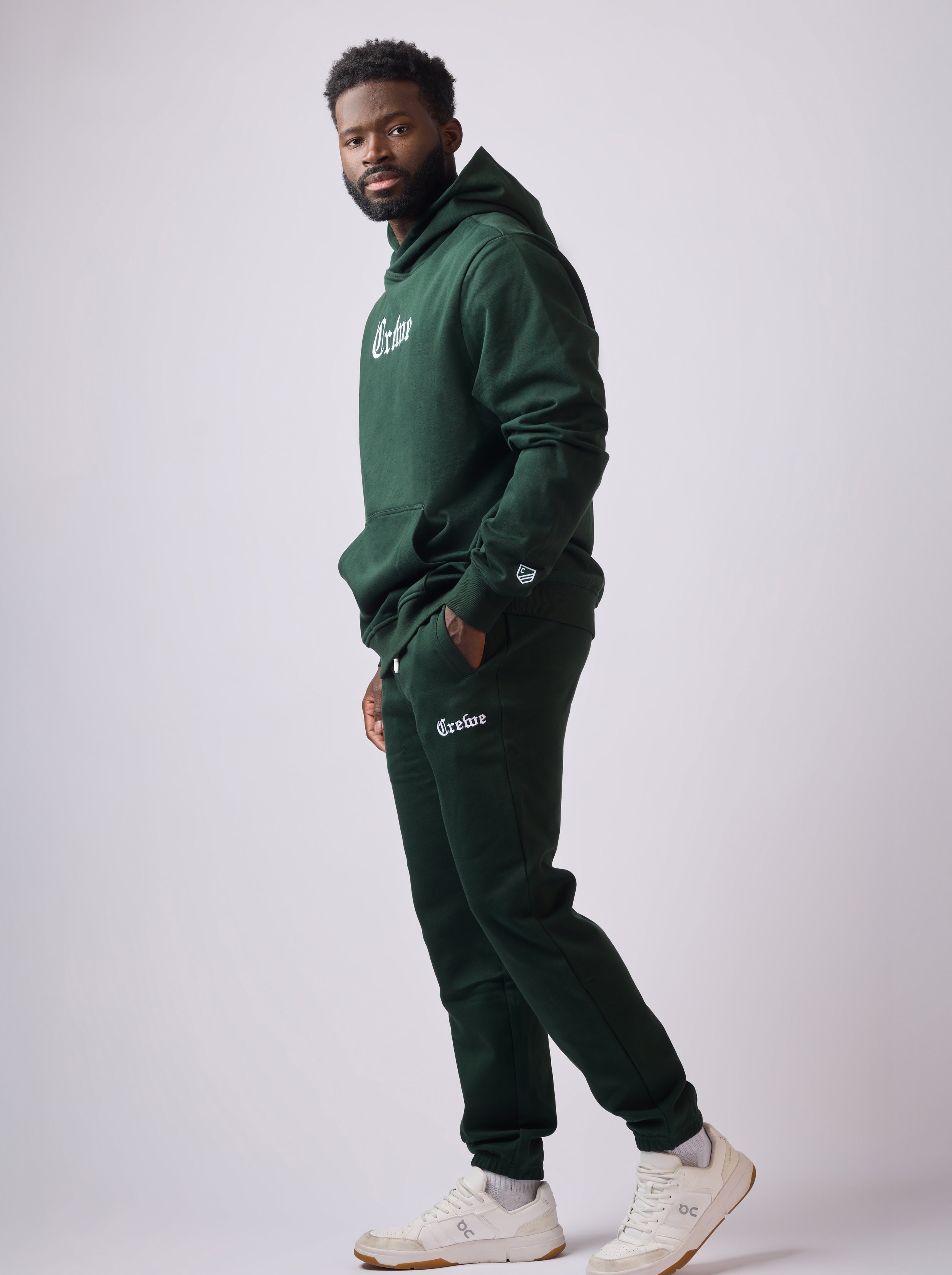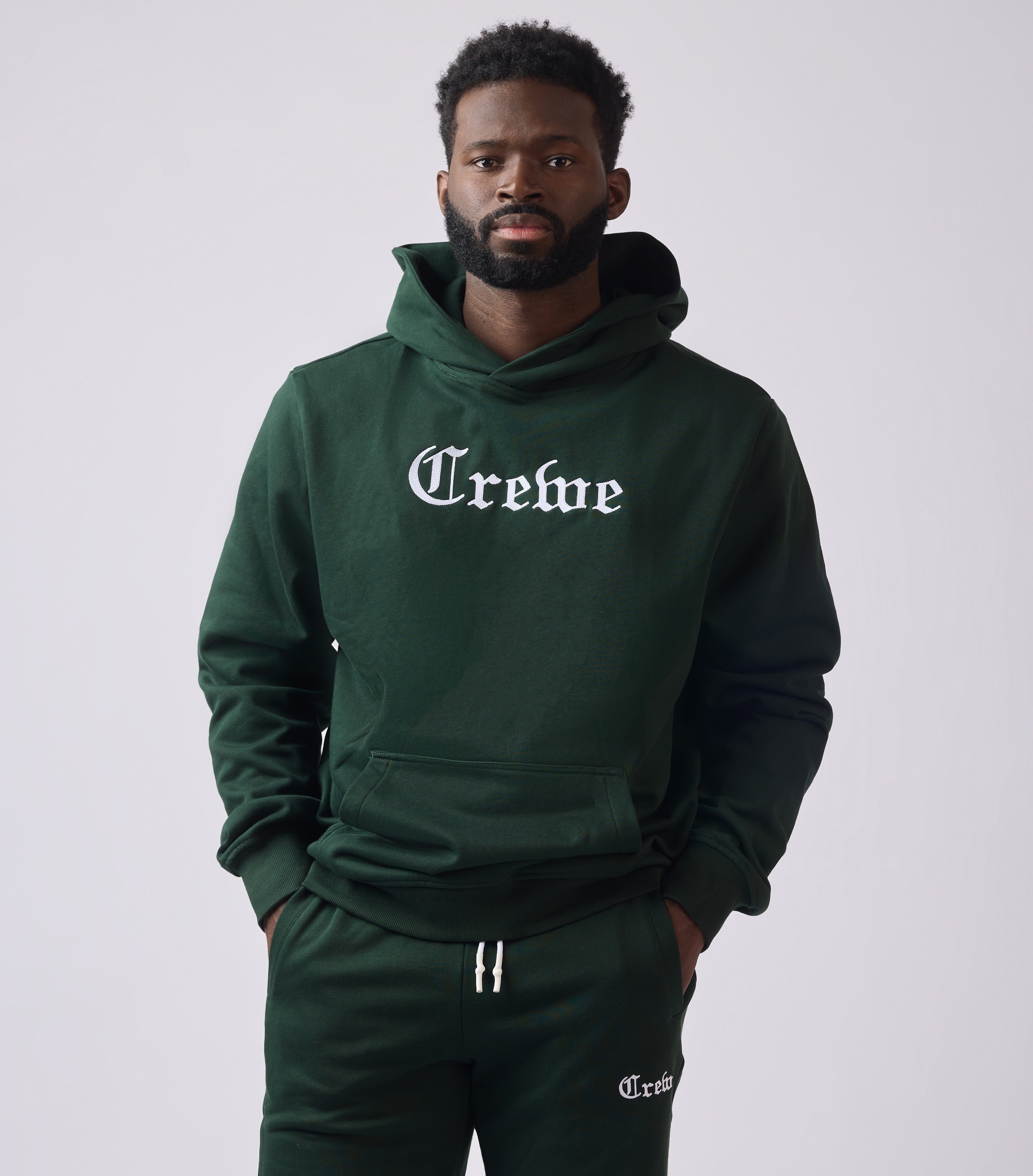 The hoodie features a relaxed unisex silhouette with a double-lined hood, kangaroo pocket, and ribbed detailing for a clean, tailored finish. Matching joggers offer a tapered fit with elastic cuffs, an adjustable drawcord waist, and roomy pockets for daily utility. Both pieces are finished with our signature “Crewe” graphic in a crisp contrast stitch, giving the set a modern heritage feel.