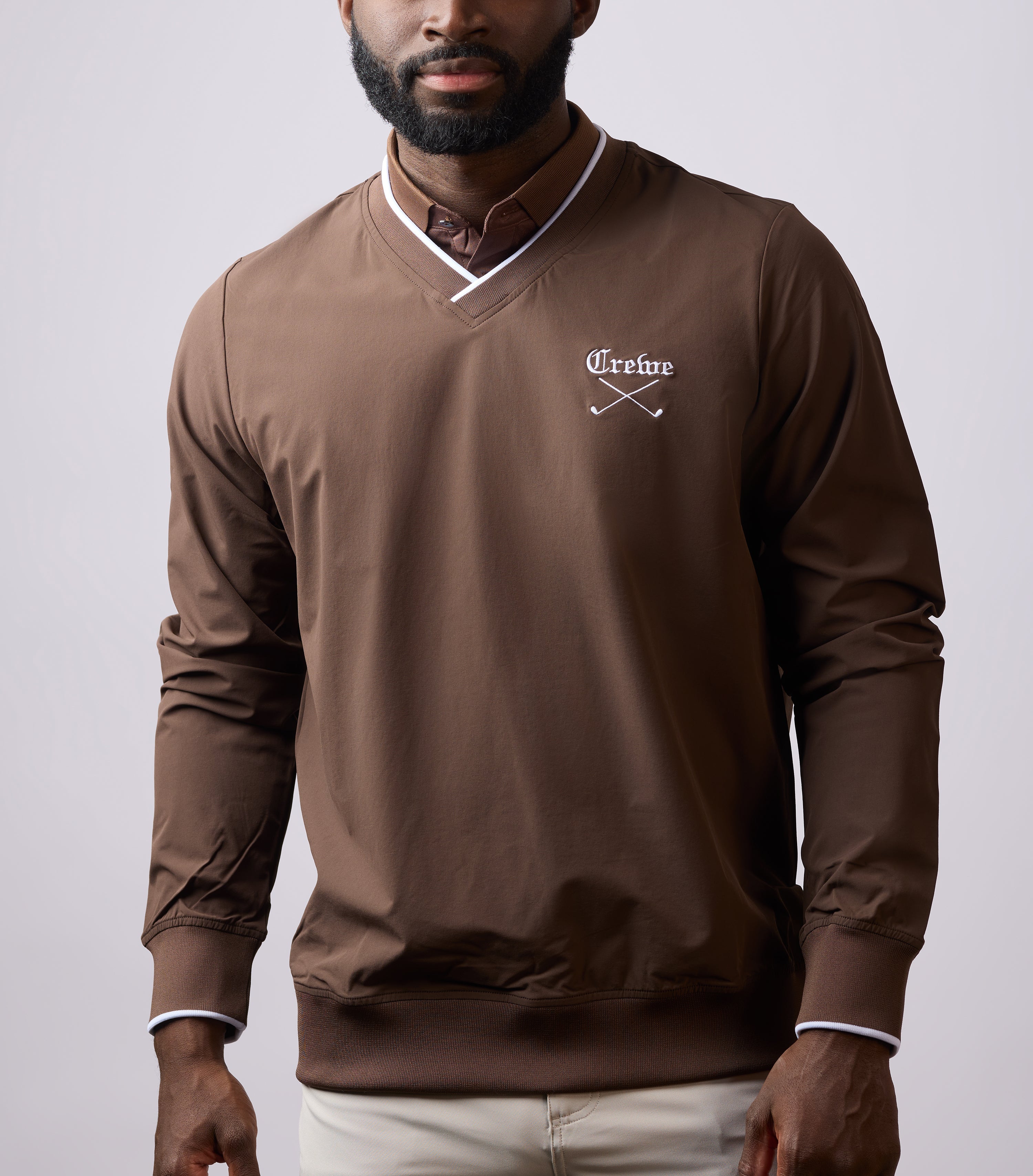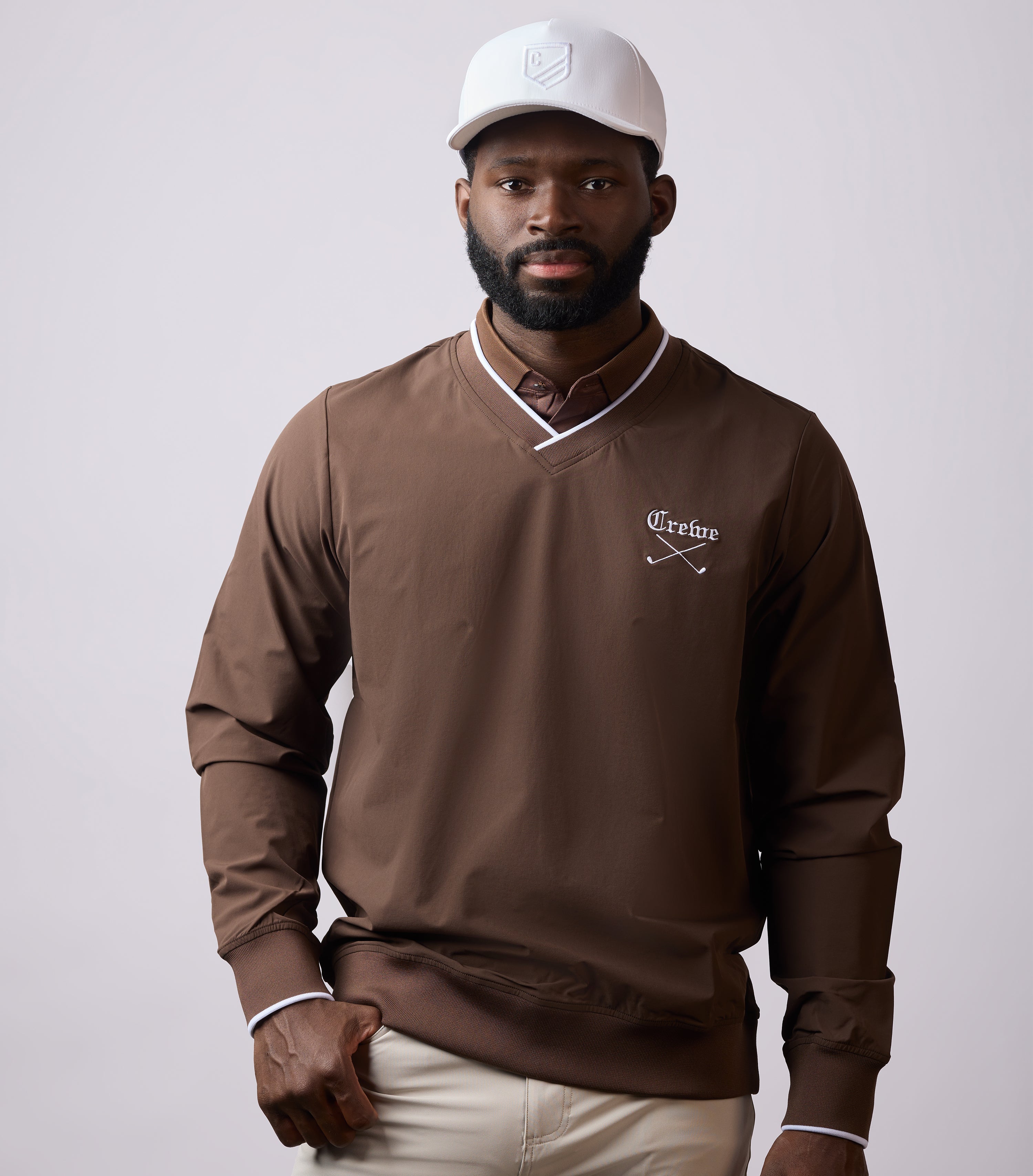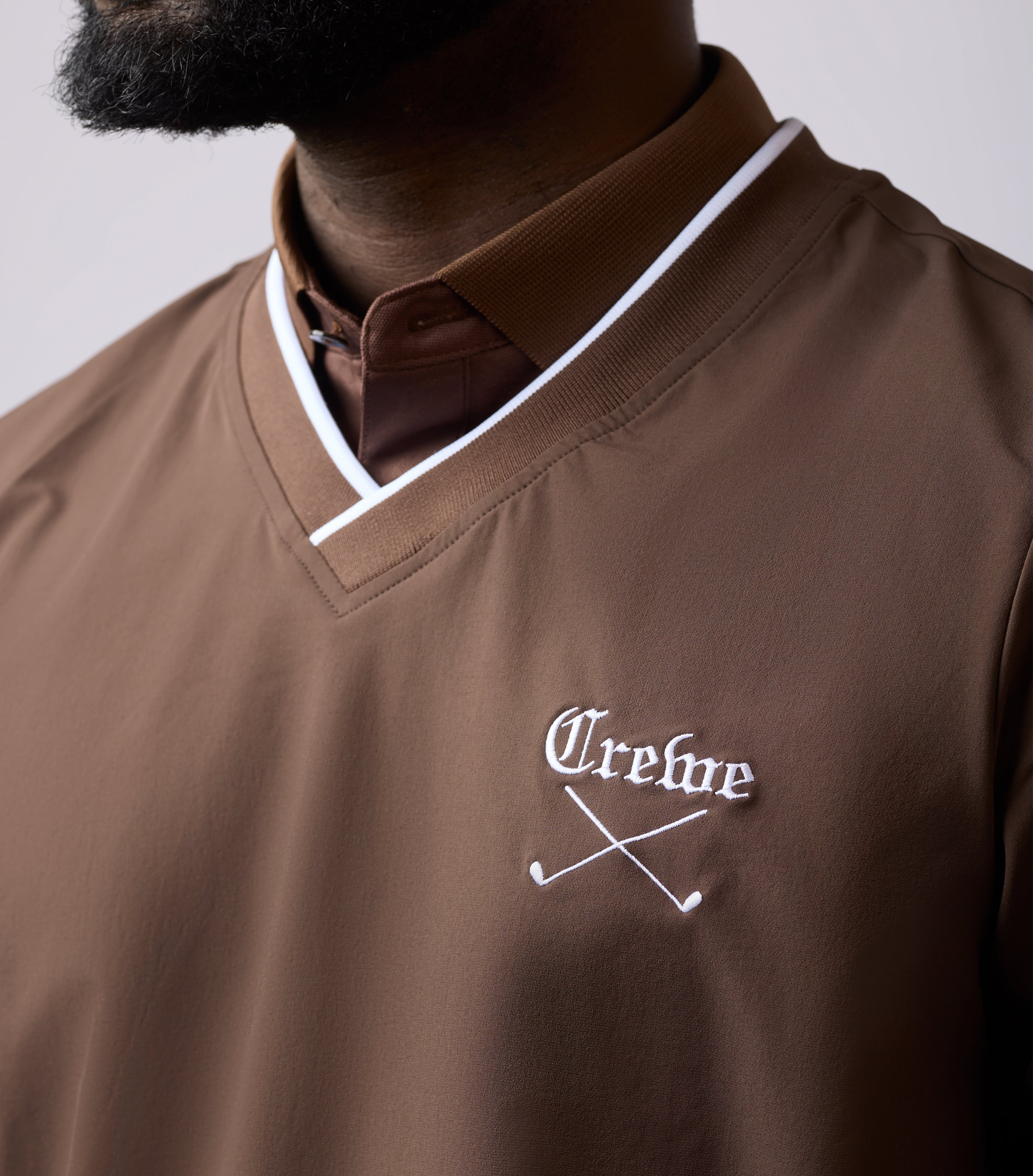 Designed with a crisp chestnut shell and accented by white ribbed cuffs and hem, this piece blends vintage golf heritage with contemporary minimalism. The V-neck profile layers cleanly over a polo or button-down, while the embroidered crest adds a refined finishing touch.